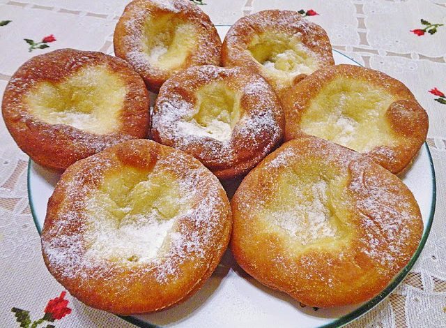 Öl in größerer Pfanne (Pfanne soll halbvoll sein) auf ca. 170 Grad erhitzen, Krapfen von der Mitte aus ausziehen, so dass ein dicker Rand bleibt und mit dem Boden nach oben einlegen, zudecken, goldbraun backen, wenden und nicht zugedeckt