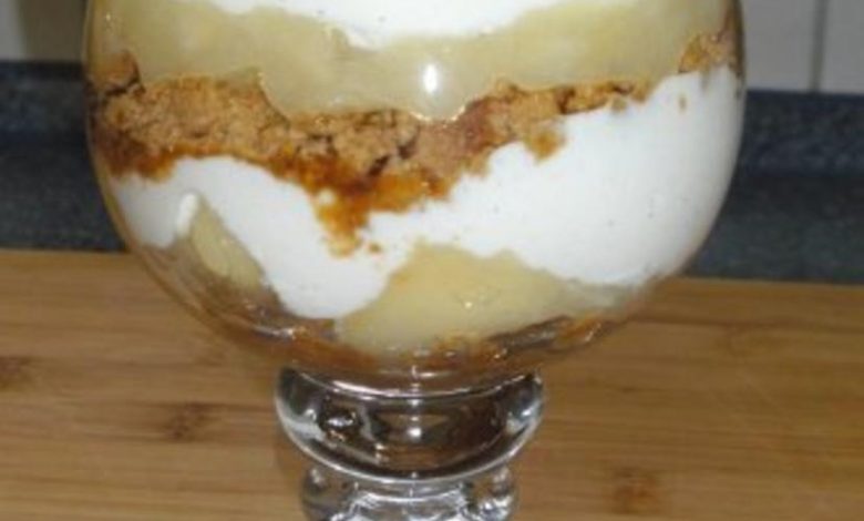 Die Keksbrösel abwechselnd mit Apfelkompott und Joghurt in 4 hohe Gläser schichten. Zum Schluss mit Kakaopulver bestäuben.
