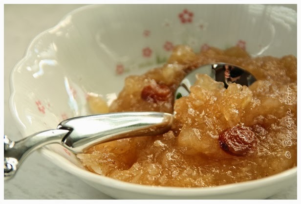 Mische nun auch den Gelierzucker, die abgetropften Rosinen, den Zimt und die Kokosflocken unter die Äpfel und lass alles zusammen etwa 1 Stunde stehen und Saft ziehen.
