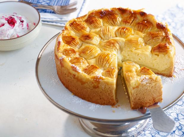 Backofen auf 180 Grad (Umluft: 160 Grad; bei der Backform auf 170 Grad bzw. Umluft: 150 Grad) vorheizen. Für den Guss saure Sahne mit Speisestärke glatt rühren. Eier, übrigen Zucker und Zitronenschale unterrühren. Mischung gleichmäßig um die Äpfel verteilen. Kuchen im Ofen in 40–45 Minuten goldgelb backen, herausnehmen.