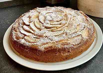 2 Äpfel schälen, entkernen und fein-blättrig aufschneiden. Runde Kuchenform mit einer Schicht Apfelscheiben auslegen und halben Teig darauf verteilen. Restliche Apfelscheiben darauf legen und restlichen Teig darauf verteilen.
