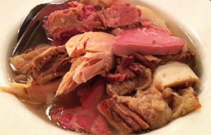 Lingua e testina vanno cotte separatamente in quanto il brodo che producono non può essere utilizzato, mentre tutte le altre parti vanno cotte insieme”. Come si fa un buon brodo? “All’acqua di cottura si aggiungono cipolla, carote e sedano tagliati grossolanamente, niente sale e niente spezie”, continua Bruno.