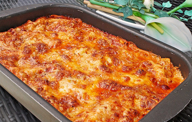 Erst ein wenig von der Hackfleischsoße in eine feuerfeste Form geben, darauf Lasagneblätter, dann wieder Hackfleischsoße, dann die Béchamelsoße auf die Hackfleischsoße geben, darauf wieder Lasagneblätter und das so weiter machen. Als letztes muss die Béchamelsoße darauf sein.