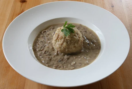 - Serviert wird das Beuschel mit Semmelknödel und grünem Salat.