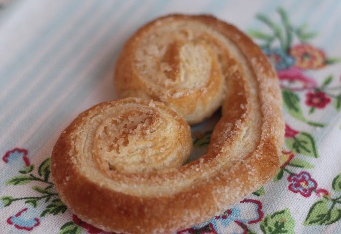 Sie erhalten zwei aneinander befestigte Rollen: Schneiden Sie diese 1 cm dick ab. Verteilen Sie die Fächer auf einem mit Backpapier belegten Backblech und verteilen Sie reichlich Kristallzucker darauf.