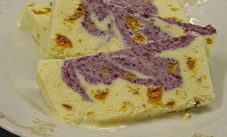 Zuerst die helle Eismasse in die Form geben. Anschließend die Blaubeermasse darauf verteilen. Mit einer Gabel durchziehen, um das Parfait zu marmorieren. Mit Folie bedeckt über Nacht einfrieren.