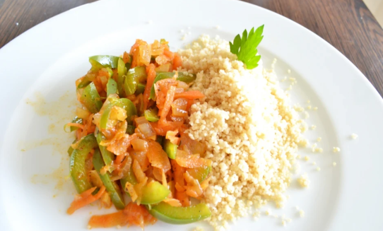 - Couscous auf eine Platte häufen, in der Mitte eine Mulde formen. Das Gemüse in die Mulde füllen, Gemüsewasser über das ganze Gericht träufeln.