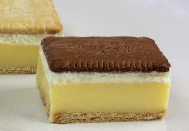 Pudding auf Unterschicht den Keksen ausschütten und gleichmäßig überall anreiben.
