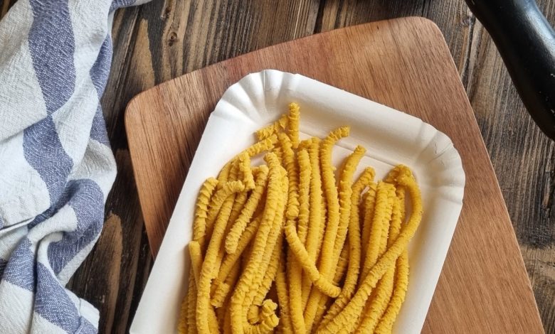 Schneiden Sie es in 3 cm hohe Stücke, zerdrücken Sie es mit einem geeigneten Werkzeug und lassen Sie die Passatelli in das Blech fallen.