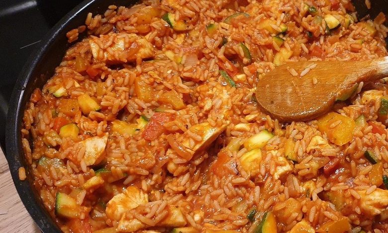 1 Zwiebel und die Paprika in kleine Würfel schneiden. Die Zwiebel in 1 TL Öl andünsten; Reis und Paprikawürfel dazu, kurz mitdünsten. Dann das Ganze mit den passierten Tomaten und der Brühe auffüllen und ca. 25-30 Minuten kochen lassen (falls dann noch zu flüssig, noch etwas weiterkochen; falls zu trocken dann noch mit etwas Brühe aufgießen). Den Reis mit Zucker, Paprika, Chili, Pfeffer, Knoblauch würzen. Hähnchenfilet in Streifen, restl. Zwiebel in große Stücke (ca. 1,5 x 1,5), und die Zucchini in Scheiben schneiden. Alles mit Salz, Pfeffer, Paprika und etwas Chili würzen, und dann im restl. heißen Öl anbraten.
