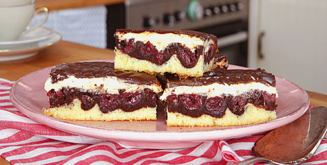 Knapp 2/3 des Teiges auf das Backblech streichen. Den Kakao sieben, mit der Milch unter den übrigen Teig rühren und gleichmäßig auf dem hellen Teig verteilen. Die Sauerkirschen auf dem dunklen Teig verteilen und mit einem Löffel etwas in den Teig drücken. Das Blech für 40 Minuten in den auf 180°C Ober-/Unterhitze in den vorgeheizten Backofen schieben.