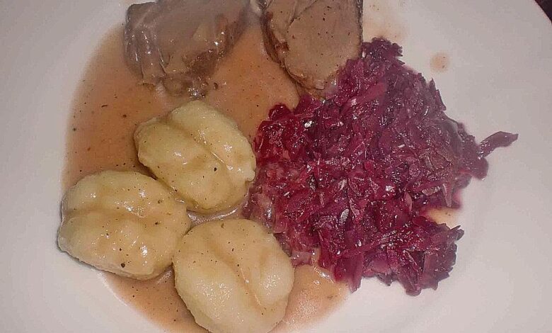 Das Fleisch unter fließendem Wasser gut abwaschen, abtrocknen und mit Pfeffer und Salz einreiben. Im Bräter mit heißem Fett übergießen und kurz anbraten. Anschließend heißes Wasser und etwas Pils-Bier angießen und das Fleisch unter regelmäßigem Beschöpfen zugedeckt in ca. 90-120 Minuten gar schmoren. In den letzten 20 Minuten die grob geschnittenen Zwiebeln mitschmoren.