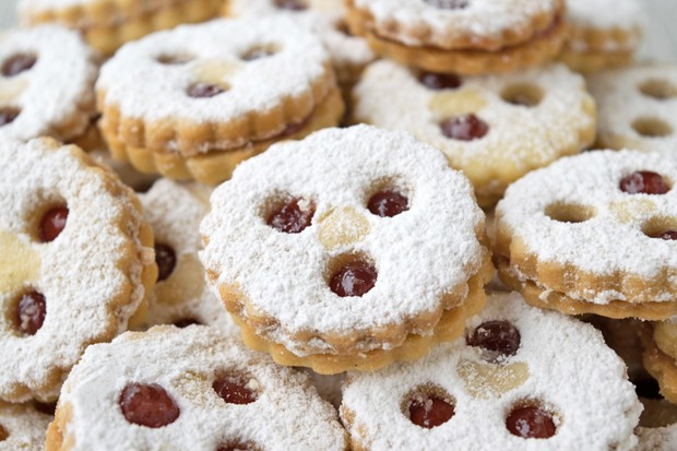 3. Auf ein mit Backpapier ausgelgtes Blech legen und bei 180 Grad backen. Danach jeweils 2 Kekse mit Marillenmarmelade zusammen setzen und mit Staubzucker bestreuen.