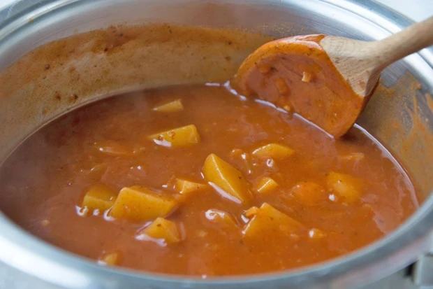 - Für das Erdäpfelgulasch zuerst die Zwiebeln schälen und fein hacken. In einem Topf mit Butter goldbraun rösten. Das Paprikapulver einrühren und mit dem Essig ablöschen.