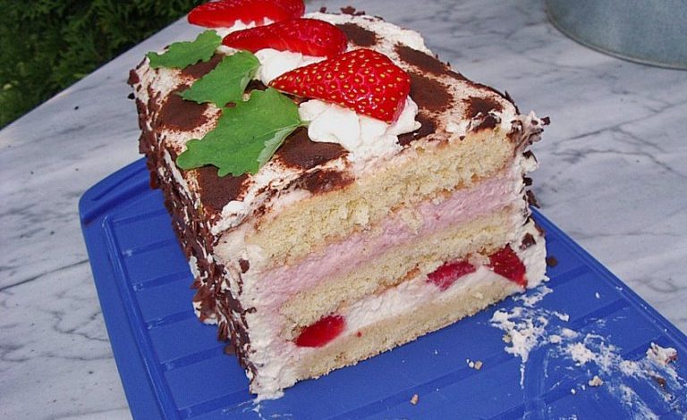 Einen Teigstreifen auf eine Tortenplatte legen. Einen Becher Sahne mit einem Beutel Sahnesteif sehr steif schlagen, evtl. mit Puderzucker süßen. Die Sahne auf den Teigstreifen streichen und die Erdbeerstückchen darauf verteilen. Den zweiten Teigstreifen darauf legen, leicht andrücken, kühl stellen.