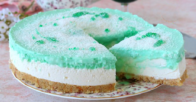 Den Wackelpudding nun mit der Frischkäse – Sahne – Mischung verrühren und das Ganze auf den Boden geben. Bis zum Verzehr für ca. 1 Stunde in den Kühlschrank stellen damit die Torte fest werden kann.
