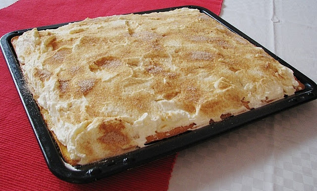Ein Backblech einfetten und den Teig darauf glatt verstreichen. 25 Minuten bei 150° backen.