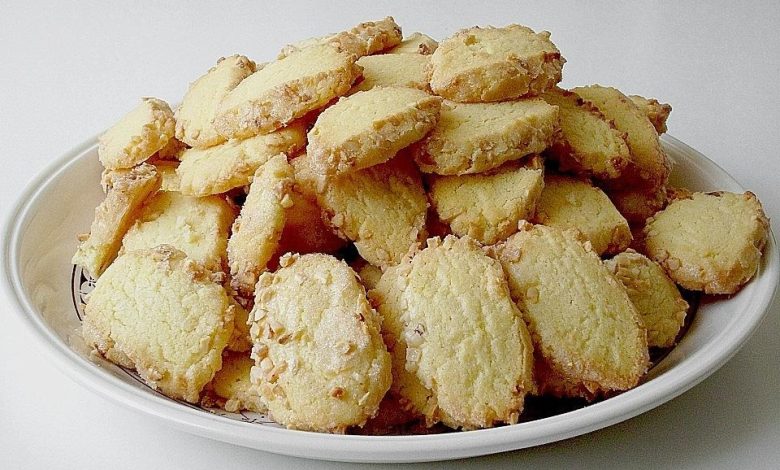 Gehackte Mandeln und Zucker vermengen und am besten auf einen großen Teller oder eine Servierplatte geben. Aus dem Teig ca. 4 cm dicke Rollen formen, mit Eiweiß einpinseln und in der Mandel-Zucker-Mischung wälzen. 1/2 cm dicke Scheiben schneiden und auf ein mit Backpapier ausgelegtes Blech legen.