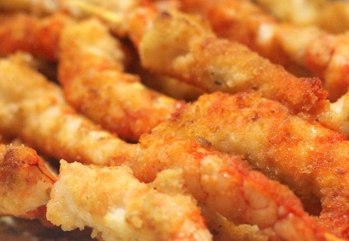- Die Garnelen säubern, schälen, in der Mehlmischung bemehlen (dadurch werden sie noch knuspriger) und auf Holzspieße stecken.