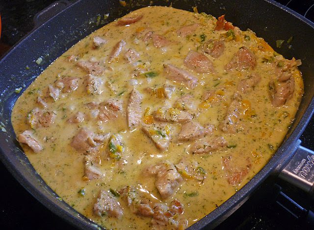 Sahne zum Fleisch geben, gehackte Paprika und Zwiebeln zugeben. Danach vorsichtig mit Senf, Honig und Dill abschmecken und alles ca. 30 Min köcheln lassen, bei geringer Hitze im geschlossenen Topf. Nochmal abschmecken.
