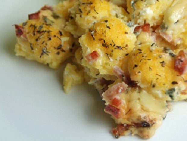 - Mit einem nassen Esslöffel Gnocchi aus dem Maisbrei streichen und in die gebutterte Form geben. Mit den Gorgonzolawürfeln und Schinken bestreuen, Butterflöckchen dazwischen setzen und den Parmesan darüber streuen. Mit Kräutern bestreuen. Sahne darüber träufeln.