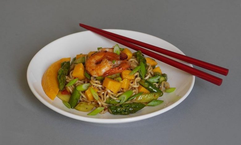 Grüner Spargel mit Mango, Garnelen und Mie-Nudeln