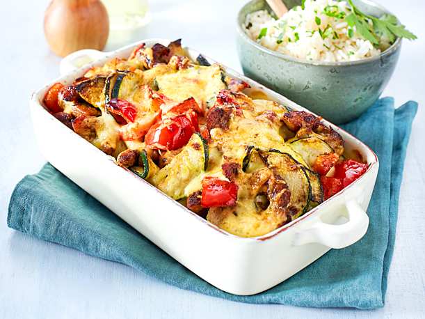 Geschnetzeltes würzen und braten bis das Fleisch durch ist, Paprika würfeln oder in Stifte schneiden, Zwiebel in Streifen schneiden und dazu geben. Ein Schuss Wasser hinzu und auf mittlerer Hitze zugedeckt köcheln lassen. In der Zwischenzeit Sahne, Schmand und Tomatenmark verrühren mit Salz, Pfeffer, Paprika, Curcuma und Kräuter abschmecken. In die Pfanne hinzufügen und 5 Min weiter köcheln lassen. Alles in eine Auflaufform geben und mit dem Mozzarella bestreuen. Zugedeckt mit Alufolie 15 Min in den Ofen bei 180° Umluft.