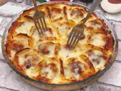 Aus dem Hackfleisch Bällchen formen und die Kartoffelscheiben in der Form mit je einem Bällchen bestücken. Die verbleibenden Kartoffelscheiben zwischen die Hackbällchen stecken, dann die Béchamelsoße darübergießen.