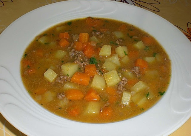 Das Hackfleisch und die in Würfel geschnittenen Zwiebeln leicht anbraten. Die Möhren und die Kartoffeln schälen, in kleine Würfel schneiden und dazugeben. Mit der Brühe aufgießen und 45 Minuten köcheln lassen.