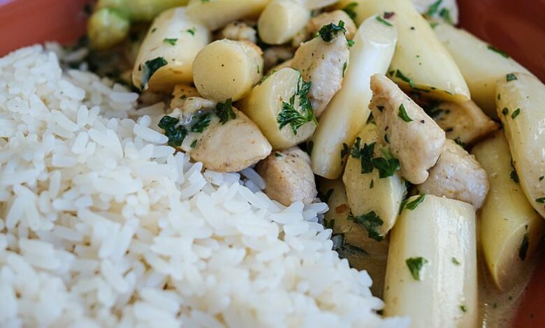 Die restl. 2 TL Olivenöl in einer Pfanne erhitzen und die Hähnchenwürfel darin fest anbraten und mit Salz und Pfeffer würzen. Anschließend herausnehmen und im verbliebenen Fett den Spargel mit den Verbeneblättchen leicht anbraten und nach ca. 5 min mit Gemüsebrühe ablöschen. Balsamico nach Geschmack zufügen, die Kokosmilch ebenfalls unterrühren und 5 min köcheln lassen.
