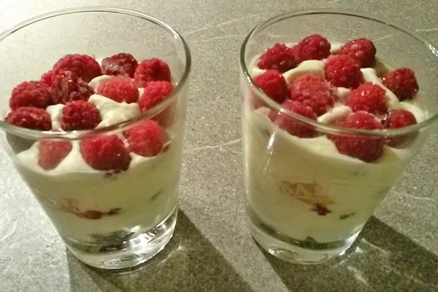 - Biskotten in kleine Stücke zerteilen, Himbeeren waschen und trocknen. Biskotten, Creme und Himbeeren im Wechsel in Gläser schichten (mit Biskotten beginnen). Über Nacht kühl stellen.