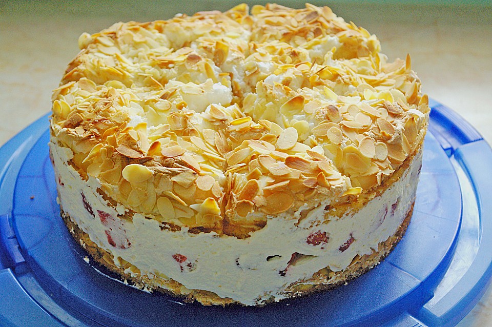 100 gr. Zucker mit Eigelb, Butter, Zucker und Milch SEHR schaumig rühren. Mehl mit Backpulver mischen und in die Creme unterrühren. Den Teig in 2 Portionen teilen, und in 2 Springformen – mit Backpapier ausgelegt – 26 cm Durchmesser – streichen. Eiweiß mit Zucker und Vanillezucker schnittfest schlagen. Masse auf den beiden Böden verteilen mit einem Esslöffel Wellen eindrücken. Mit Mandelblättchen bestreuen, und bei 200°/C, Mittelschiene/25-30 Min. backen.