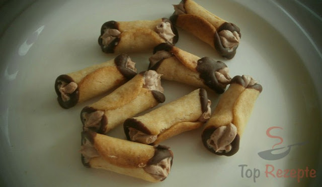 Ein Ei mit Zucker über Wasserdampf schaumig schlagen. Vom Wasserdampf nehmen und portionsweise Butter unterrühren. Zum Schluss gesüßtes Kakaopulver beimengen. Die Creme in eine Spritztüte füllen und die Röllchen damit von beiden Seiten füllen.