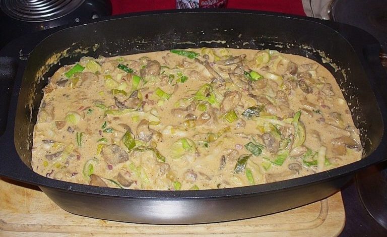 Das Fleisch klein schneiden und mit der Würzmischung vermengen und in einen geölten Bräter geben. Den Käse darüber legen. Dann den klein geschnittenen Porree darüber verteilen, hierüber die Lage Champignons. Die Zwiebeln werden mit dem in kleine Würfel geschnittenen Bauchspeck gedünstet. Dieses muss erkalten.