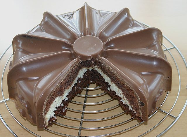 Bei 175° (Umluft) ca. 45 min. backen. Nach dem Auskühlen mit der Kuvertüre überziehen.