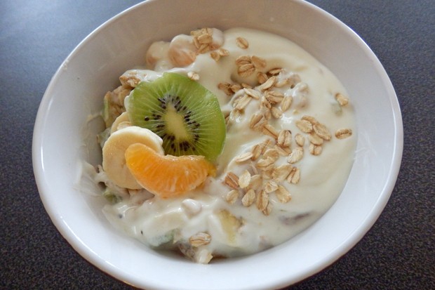 - Die Banane, Kiwi und Mandarine schälen und würfelig schneiden. Das Joghurt in eine Schüssel geben und das Obst sowie die Haferflocken hinzugeben. Die Zitrone auspressen und den Saft ebenfalls hinzufügen und alles miteinander gut verrühren und servieren.