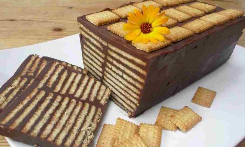 2. Jetzt Butterkekse lagenweise abwechselnd mit der Kakaomasse in eine mit Pergamentpapier oder Frischhaltefolie ausgelegte Kastenform füllen, und die unterste Schicht muss aus Kakao, die Oberste aus Keksen bestehen.