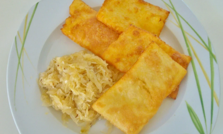 - Auf einem Brett Mehl verteilen und dann den Teig ausrollen und Rechtecke ausschneiden. Im Frittenfett goldbraun backen und mit dem Sauerkraut servieren.
