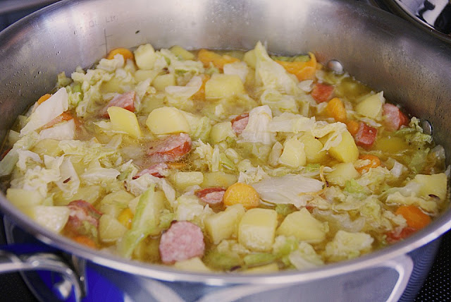 Das Öl im Topf erhitzen, darin die Zwiebeln glasig anschwitzen. Kartoffeln, Wirsing und Möhren einige Minuten mitdünsten. Die Brühe angießen, dann den Kümmel dazu, alles umrühren und die Suppe aufkochen lassen. Zugedeckt etwa 20 Minuten köcheln lassen.