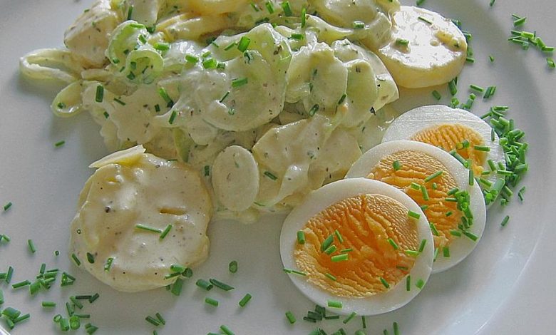 Die gehobelte Gurke mit den Händen leicht auspressen, damit der Salat nachher nicht zu stark Wasser zieht. Zwei der Eier in Scheiben schneiden, Kartoffeln pellen und in Scheiben schneiden. Kartoffeln, Gurken, Eier und Zwiebeln mit der Remoulade vermischen.