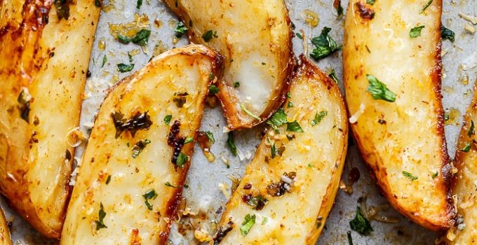 2. Nun die Kartoffeln schälen und in Spalten schneiden und in die feuerfeste Form geben und gut mit dem Öl vermengen, so dass die Kartoffelspalten überall gut benetzt sind. Die Kartoffelspalten nun im auf 190 Grad vorgeheizten Backofen ca. 50 – 60 goldbraun backen.