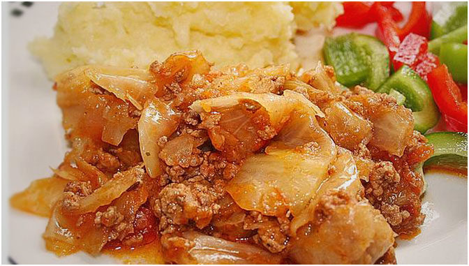 In einem großen Topf die gehackten Zwiebeln andünsten. Das Hack dazugeben und anbraten. Nach und nach den kleingeschnittenen Kohl zugeben und etwas mitbraten, damit er etwas anbräunt. Gemüsebrühe und kleingeschnittene Tomaten dazu.