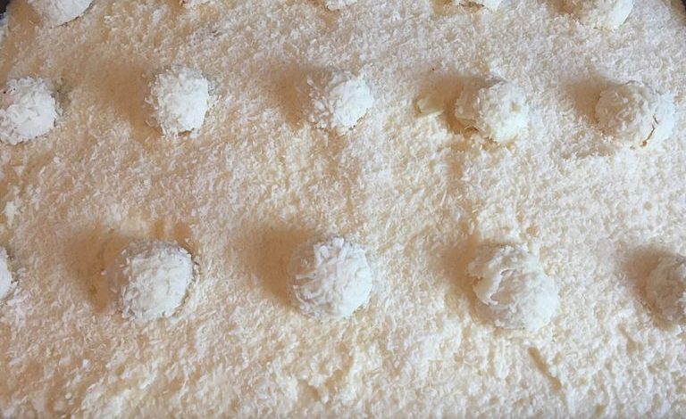 Creme anschließend gleichmäßig auf dem Kuchen verteilen. Mit den restlichen 75 g Kokosraspeln bestreuen.