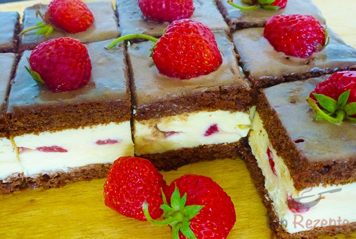 Köstlicher schokokuchen mit creme und erdbeeren