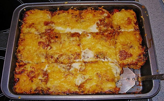 Die letzte Schicht sollte die Bechamelsauce bilden. Dick mit geriebenem Käse bestreuen, Butterflöckchen darauf setzen. Die Lasagne bei 180°C im Ofen ca. 30 – 40 Minuten überbacken, bis die Kruste goldbraun ist.