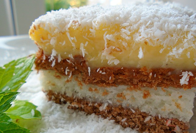 Die Füllung I. zubereiten. Dafür die Eiweiße mit Zucker steif schlagen. Die Kokosraspeln unterrühren. Die Füllung auf dem Teig verstreichen und mit der zweiten Teigplatte zudecken.