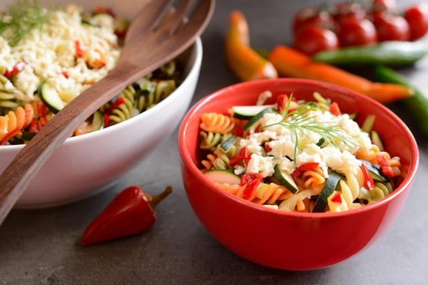 - Spiralnudeln in einen großen Topf mit siedendem Wasser geben und 10-12 Min. al dente kochen. Abtropfen lassen, in einer Lage auf einem Backblech ausbreiten und trocknen lassen. Ohne Deckel kalt stellen.