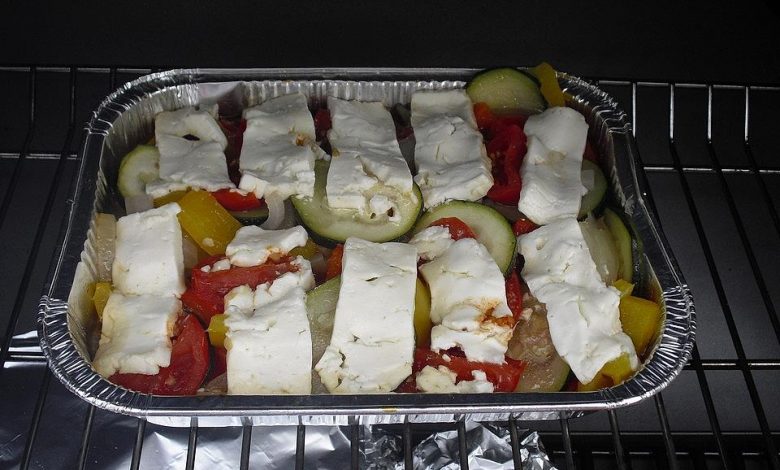 Ein ausreichend großes Blatt Alufolie zu einer Schale formen. Zucchini, Zwiebeln und Tomaten darauf geben. Darauf den Schafskäse verteilen und oben drauf die Zitronen. Mit Olivenöl gut bedecken, sodass der Aluboden bedeckt ist.