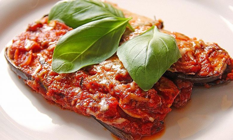 Derweil Zwiebeln und Knoblauch in Öl andünsten, Tomaten hinzugeben und alles gut einkochen lassen, mit Salz, Pfeffer und Basilikum würzen. In einer flachen Auflaufform die Hälfte der Auberginen verteilen, darauf die Hälfte der Sauce geben und darauf die Hälfte des geriebenen Käses geben, dann wieder Auberginen, Sauce, Käse schichten und alles im Ofen bei 180 – 200 Grad 20 Min. überbacken.
