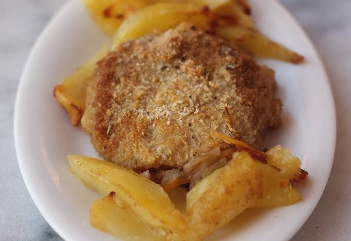 Mit provenzalischen Kräutern panierte Seitan-Medaillons und Ofenkartoffeln